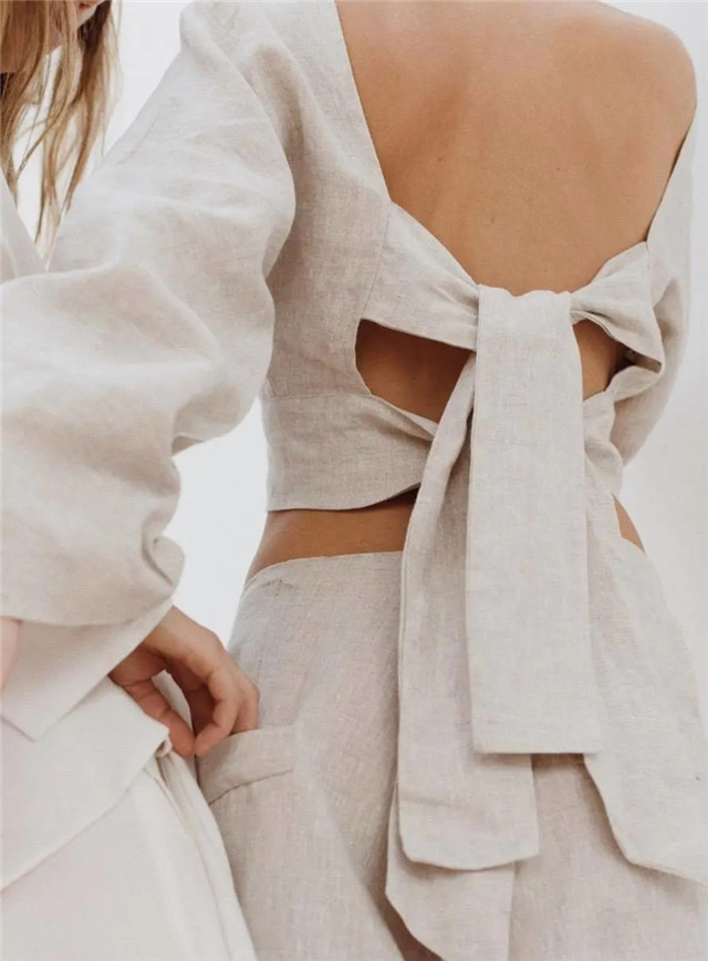 大面积的裸露皮肤露出精致的锁骨,对于上身偏胖或者是虎背熊腰的女孩,其实更加友好,搭配上高腰裤,既不会过于紧绷,又能展现出慵懒舒适的一面。而亚麻面料则为整体的造型更加分凸显出一种低调的奢华。