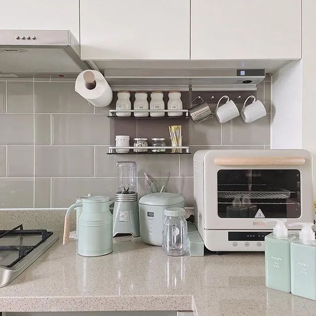 不设吊柜,用隔板、置物架补充收纳,所有的常用物品,都在一伸手就能拿到的位置,一目了然方便随时取用。