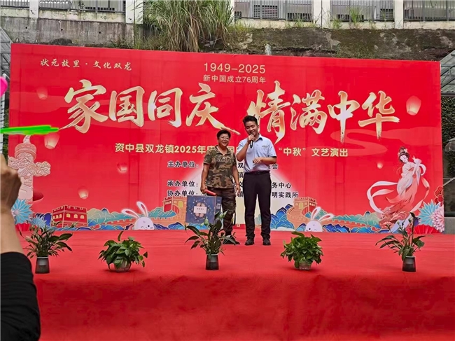 9月28日,邮储银行资中县支行与资中县双龙镇文化服务中心共同打造的“家国同庆 情满中华”文艺汇演在此上演。由各村(社区)舞蹈队带来的《祝福祖国》《花好月圆》等节目,以翩跹舞姿抒发家国情怀,引得台下掌声雷动。“节目好看,还能学防诈骗知识,一举两得!”带着孩子观看演出的李女士连连称赞。
