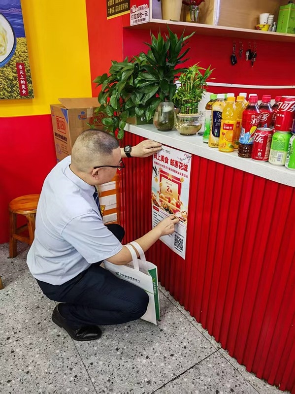 为扩大活动知晓度,安州区支行提前开展宣传。一方面深入核心餐饮商圈,在合作商户门店张贴活动海报,让消费者在进店瞬间就能捕捉到满减信息;另一方面在楼盘设立综合服务展台,现场演示餐饮满减的参与步骤,并安排资深房贷客户经理坐阵。