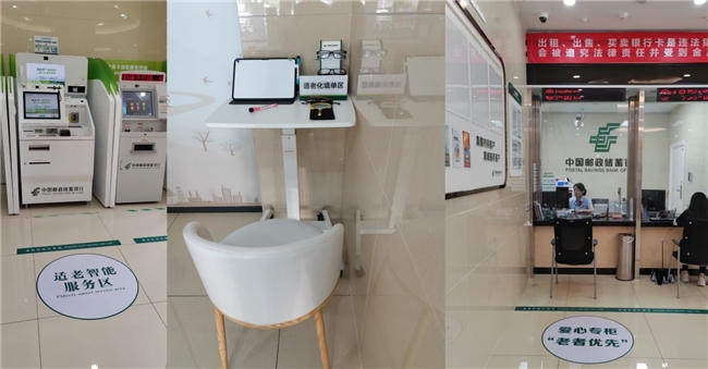 邮银银行嘉陵区支行结合老龄人群的生理特点与实际需求,对网点进行适老化改造,设置适老智能服务区、填单区与爱心专柜,有便于老年客户使用的专属区域进行业务办理。除此,网点通过增设专属设施来满足老龄人群,比如在营业场所提供老花镜、放大镜、爱心轮椅、热饮、应急药品箱、便民服务箱、手机充电设备等暖心助老用品,为前来办理业务的老年客户提供便利。