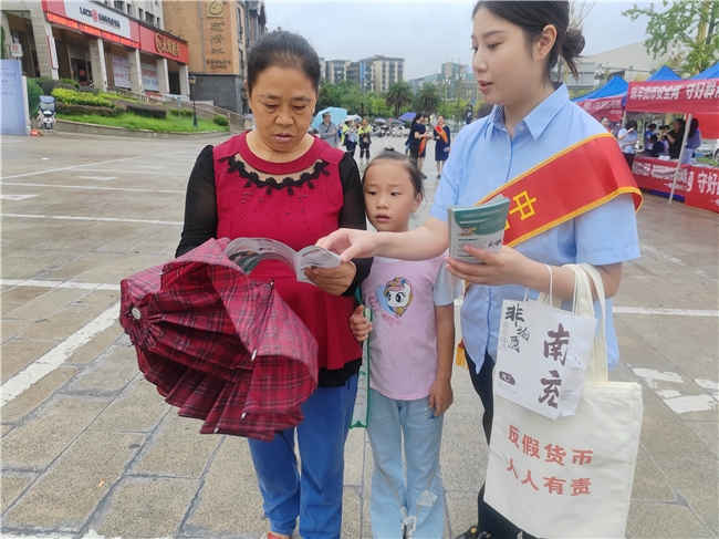 南部县支行聚焦城区居民需求,在新世纪广场设简洁务实的宣传点:一条醒目横幅、几块清晰展板、一个随时应答的咨询台,无花哨布置却满是干货。工作人员主动递发折页,对“误收假币怎么办”“新版人民币咋辨别”等高频问题,拿实物对比着讲、掰开揉碎了说;见市民拍照存展板内容,还主动帮忙调整角度,热烈氛围中,市民的识假能力悄然提升。